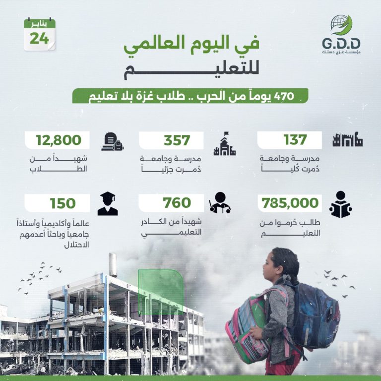 🎓 بينما يحتفل العالم في 24 يناير باليوم العالمي للتعليم، تتصدر غزة قائمة مؤلمة من الإحصائيات الكارثية التي تعكس حال التعليم في المدينة المحاصرة.