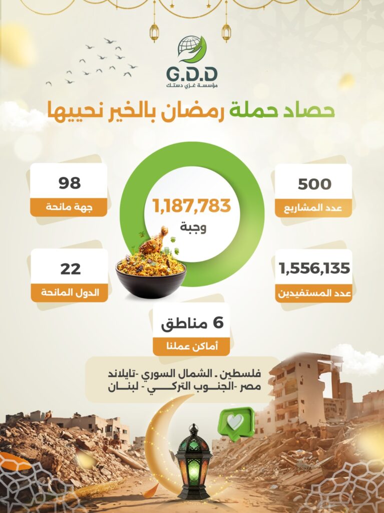 تم توزيع 1.185.007 وجبة وصلت إلى الصائمين في المخيمات ومراكز الإيواء والأسر المتضررة.
