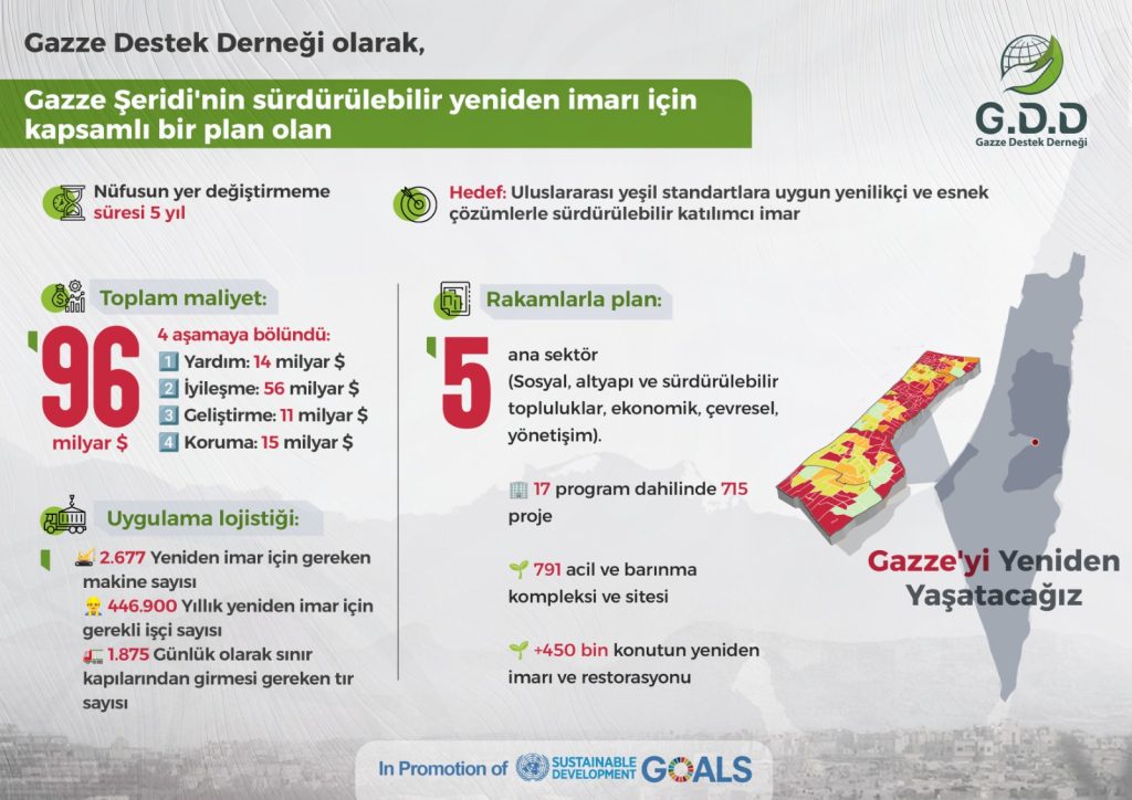 Gazze Şeridi 730 gün süren yıkıcı bir soykırıma şahit oldu. Bölgeye 10 nükleer bombadan daha güçlü, 150 bin tondan fazla patlayıcı atıldı. Günlük yaşamın %81‘inden fazlasını etkileyen büyük insan kayıplarına ve yıkıma yol açtı. Bu benzeri görülmemiş insani yaşam krizi ve acil yeniden imar ihtiyacı altında bizler, Gazze Destek Derneği olarak, bölge sakinlerinin topraklarından çıkarılmasına izin vermeden yeniden imarı güvence altına alan, Gazze Şeridi’nin 5 yıllık bir süre içinde sürdürülebilir bir şekilde yeniden imarı için kapsamlı stratejik bir plan oluşturduk.